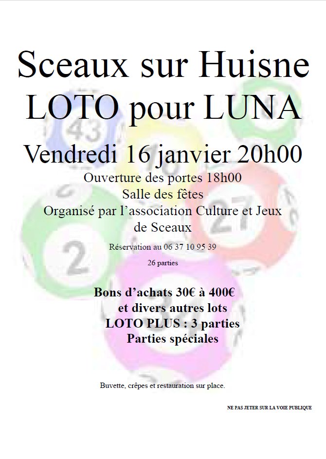 Meet us at the Salle polyvalente in Sceaux-sur-Huisne for an evening of bingo. Opening time: 6pm.