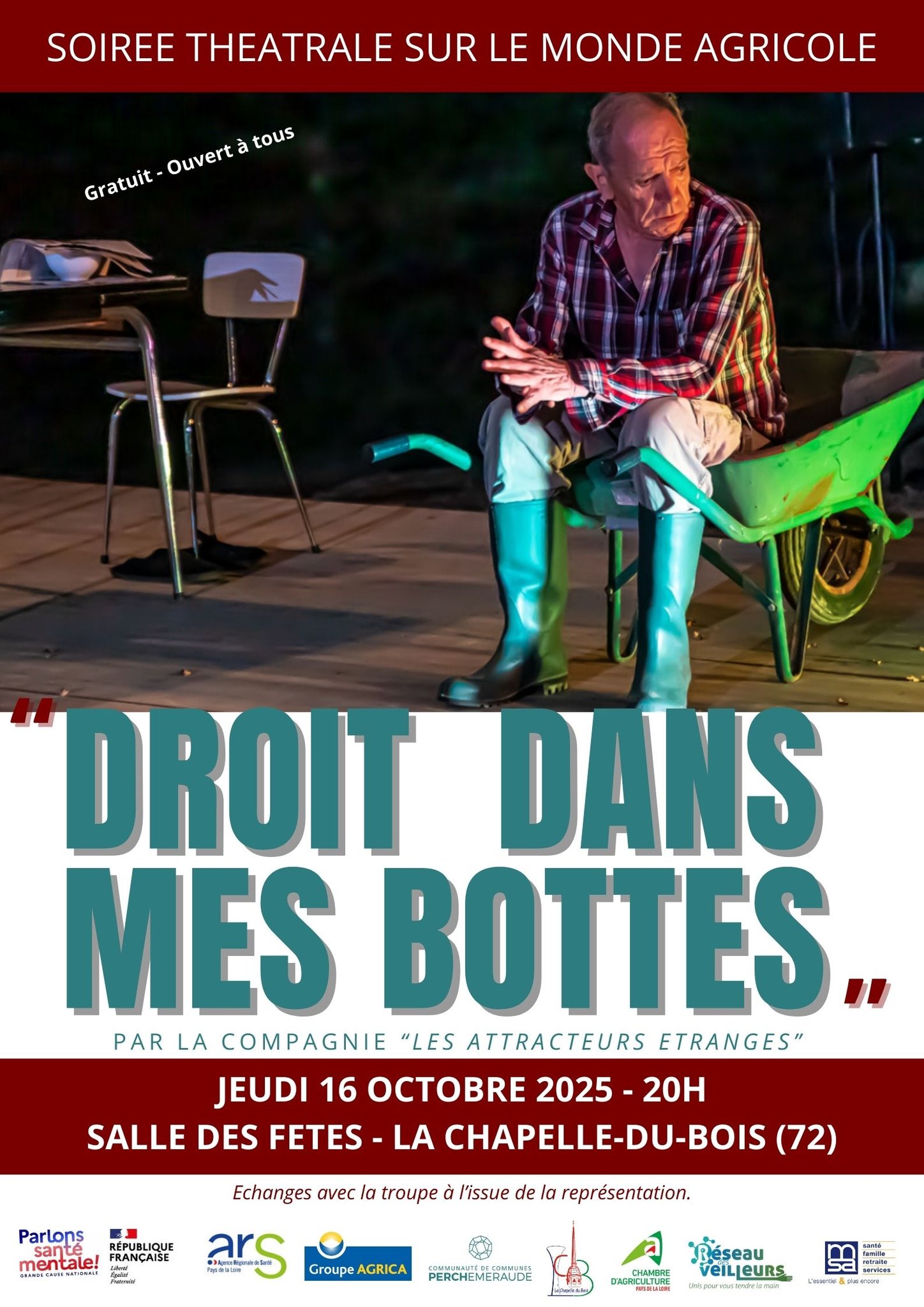 An evening of theatre about the world of agriculture. The company Les Attracteurs Étranges presents the play "Droit dans mes bottes", an immersion into the realities of the farming world. Free admission. Open to all. There will be a discussion with the company after the performance. Free admission.