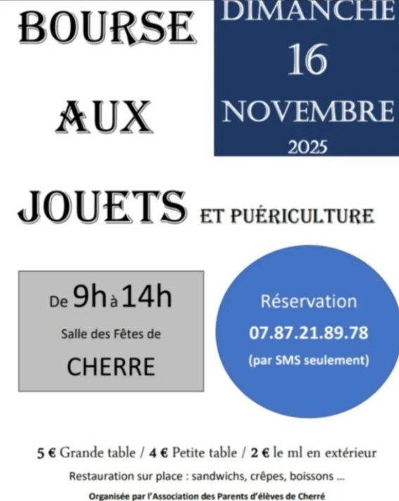 L'APE de Cherré organise sa bourse aux jouets et puériculture le 16/11/2025 de 9h à 14H à la sal...