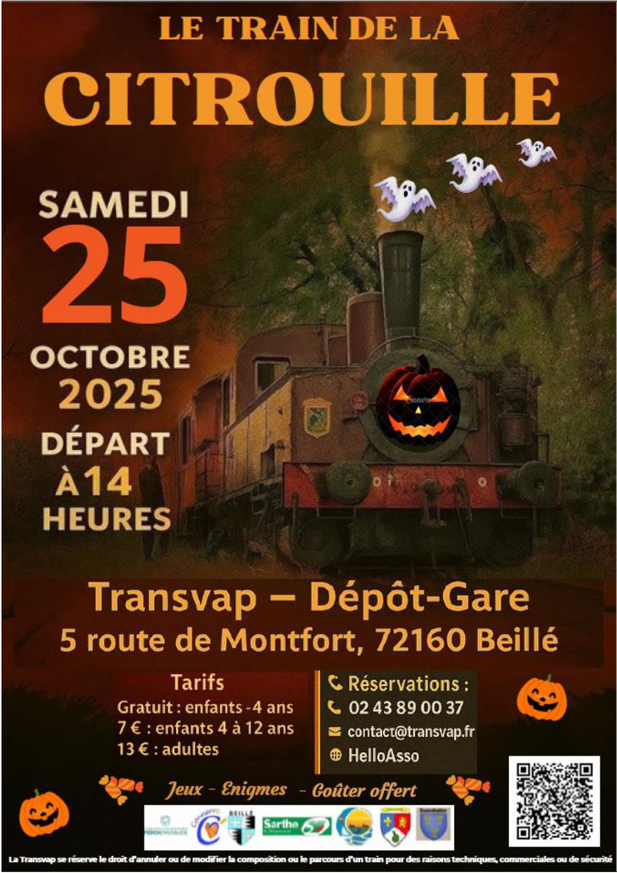 Nos sorcières sont de retour afin de proposer un après midi avec du train historique, des jeux suivi d'un gouter. Elles vous attendent sur Beillé pour passer un bon moment. RDV : 14h sur le site de la TRANSVAP à Beillé. Gratuit pour les enfants de - de 4 ans. 7 Euros pour les enfants de 4 à 12 ans. 13 Euros pour les adultes. Renseignements et réservations : 02 43 89 00 37 - transvap72@wanadoo.fr - https://www.helloasso.com/.../train-de-la-citrouille-2