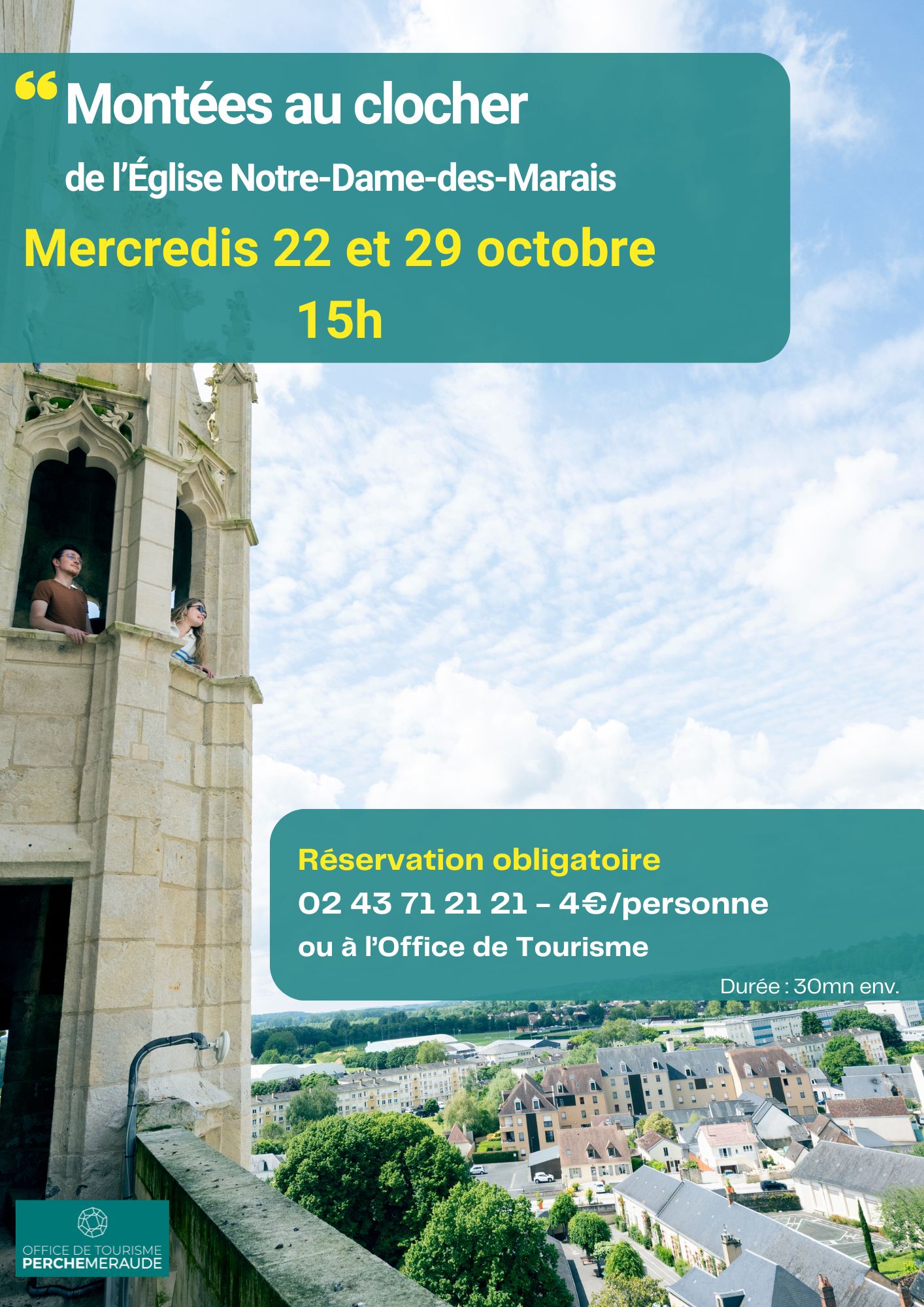 L'occasion de découvrir la ville de La Ferté-Bernard en prenant de la hauteur. Après avoir escalader les 164 marches qui mènent en haut du clocher vous pourrez profiter d'une vue imprenable sur "La Venise de l'Ouest" et ses environs. Visite possible dès l'âge de 9 ans. Limité à 9 personnes, prévoir de bonnes chaussures et vêtements chauds. RESERVATION OBLIGATOIRE auprès de l'Office de Tourisme. Tarif : 4.00 €/pers